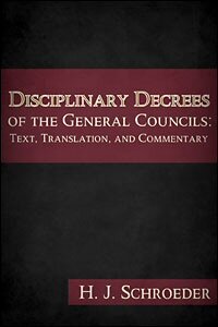 Disciplinary Decrees of the General Councils: Text, Translation, and Commentary covers the disciplinary decrees enacted by the Catholic Church in her general councils up to and exclusive of the Council of Trent. H. J. Schroeder provides the original texts, English translations and commentary on the historical background of the decrees. "For, after all, the full scope and import of a conciliar decision, whether of a dogmatic or disciplinary nature, can be grasped only when studied in the light of the conditions and forces that produced it." The work includes selected canons from the first seven councils (the full text of these councils can found in volume 14 of the Early Church Fathers Series), and all the canons from the great Medieval Councils. It also includes selected canons from the late medieval councils.